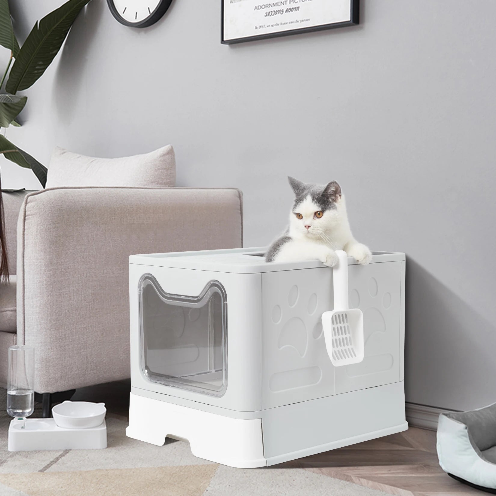 - Slide-out drawer streamlines cleaning—simply scoop waste, replace litter, and fold the lid for fast, compact storage when not in use.