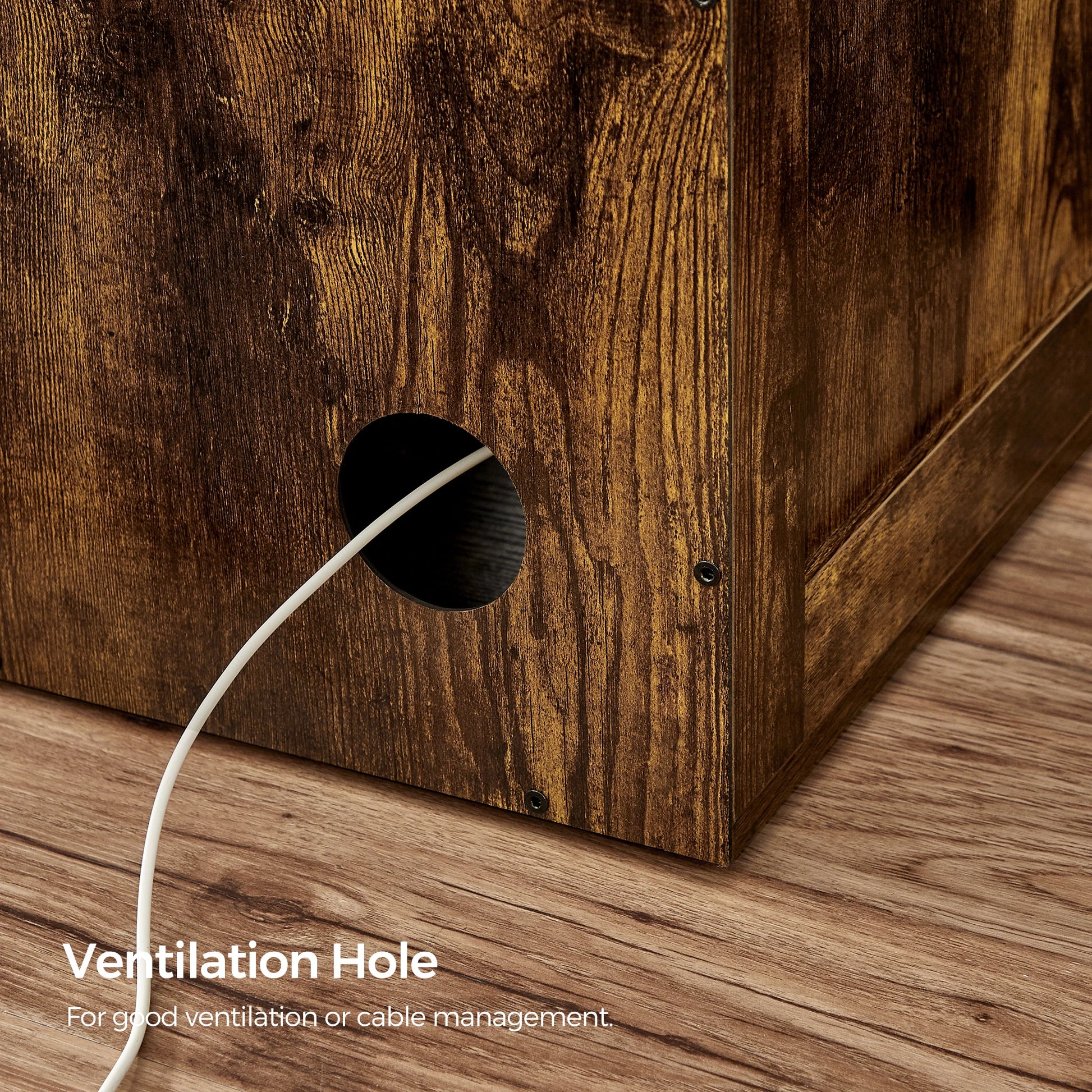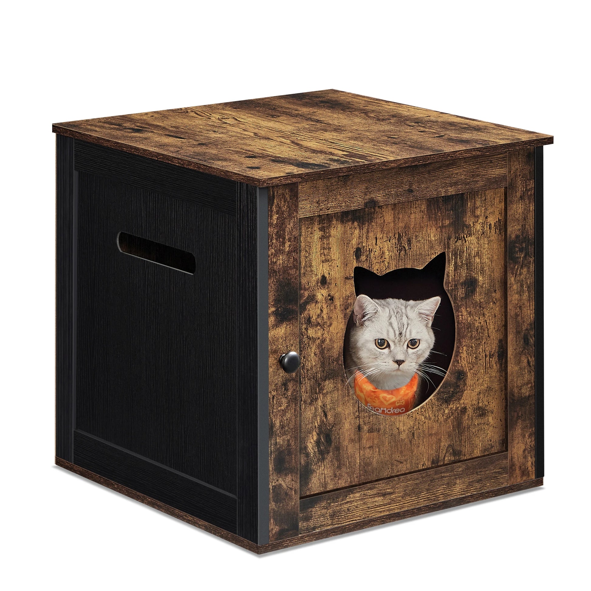 - Rustic brown veneer on particleboard blends with your décor while hiding mess and odors behind a cat door and concealed design.